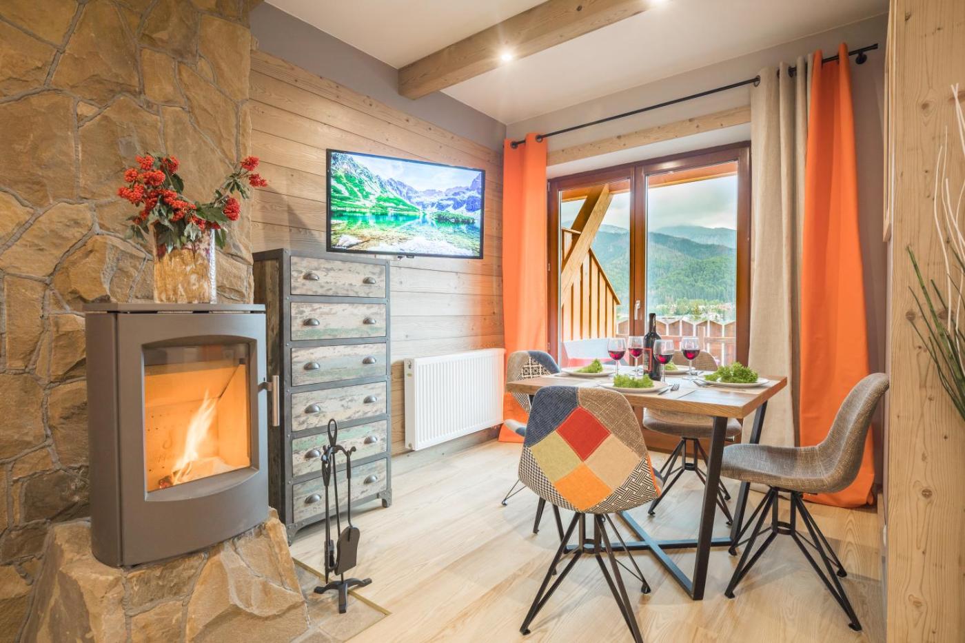 Apartament z 1 sypialnią i tarasem. This apartment offers a fireplace. Featuring a private entrance, this air-conditioned apartment comprises 1 living room, 1 separate bedroom and 1 bathroom with a walk-in shower and a hairdryer. Guests will find a stovetop, a refrigerator, kitchenware and a microwave in the well-fitted kitchenette. The apartment also provides guests with a barbecue. Boasting a terrace with mountain views, this apartment also provides a washing machine and a flat-screen TV. The unit offers 2 beds. Apartament - 4 osobowy. Powierzchnia pokoju ok.: 40 mkw. ;